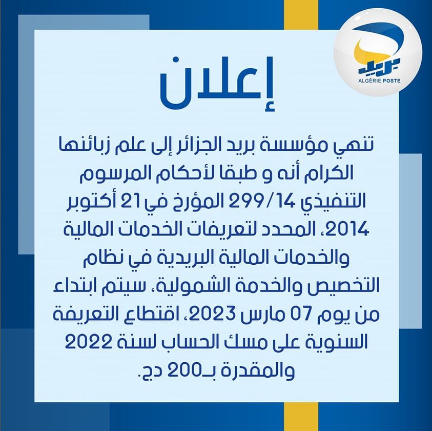 Algérie Poste a publié un communiqué aujourd’hui pour annoncer la mise en place d’une nouvelle taxe à partir de demain, le 7 mars 2023. Cette taxe sera prélevée annuellement sur le compte des utilisateurs et concerne la tenue de compte pour l’année 2022. Le montant de la taxe a été fixé à 200 DA.